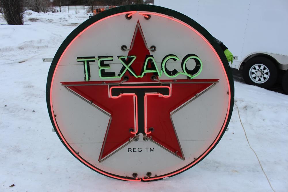1 SIDED PAINTED TIN. THIS IS A VERY INTERESTING NEON SIGN. APPEARS TO BE AN ORIGINAL OLD NEON SIGN THAT HAS BEEN REDONE. 66 DIA, 12 THICK. WORKS. APPROXIMATE SHIPPING COST $150 TO $450.
