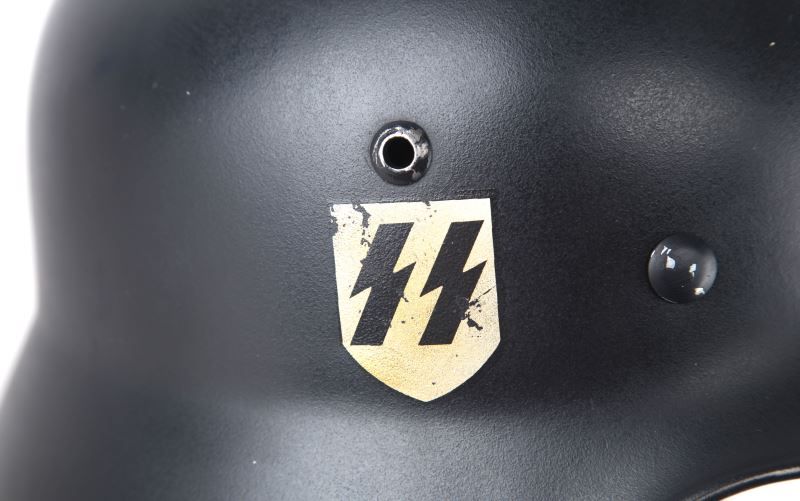 WWII German M35 helmet shell, professionally restored with SS and party shield decals, liner, and chin strap. Excellent display / prop / reenactment item. This lot has a reserve.