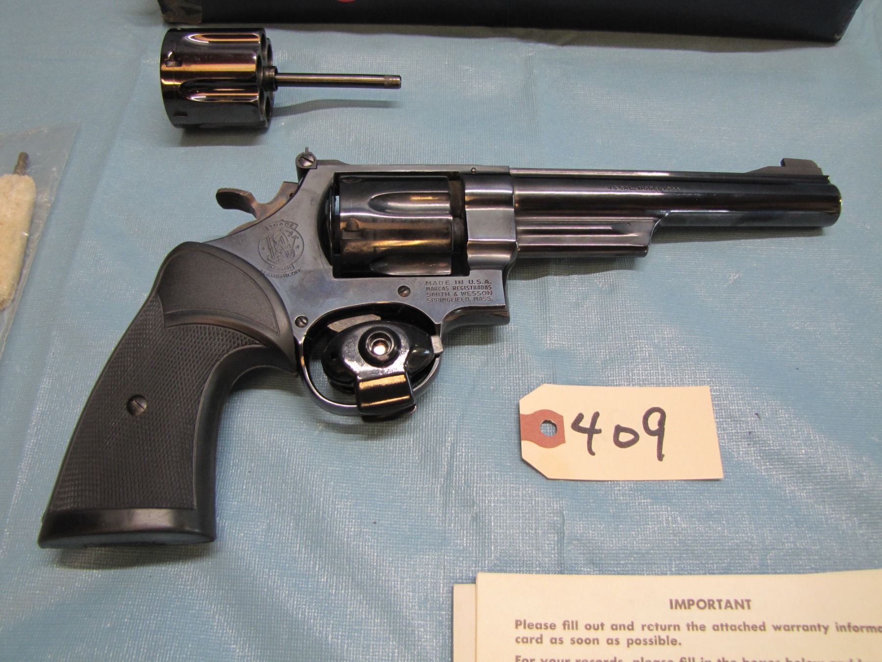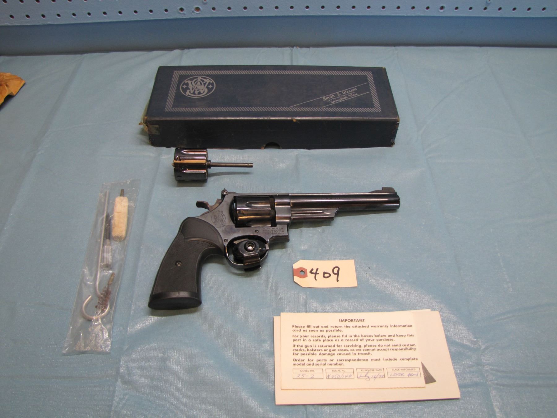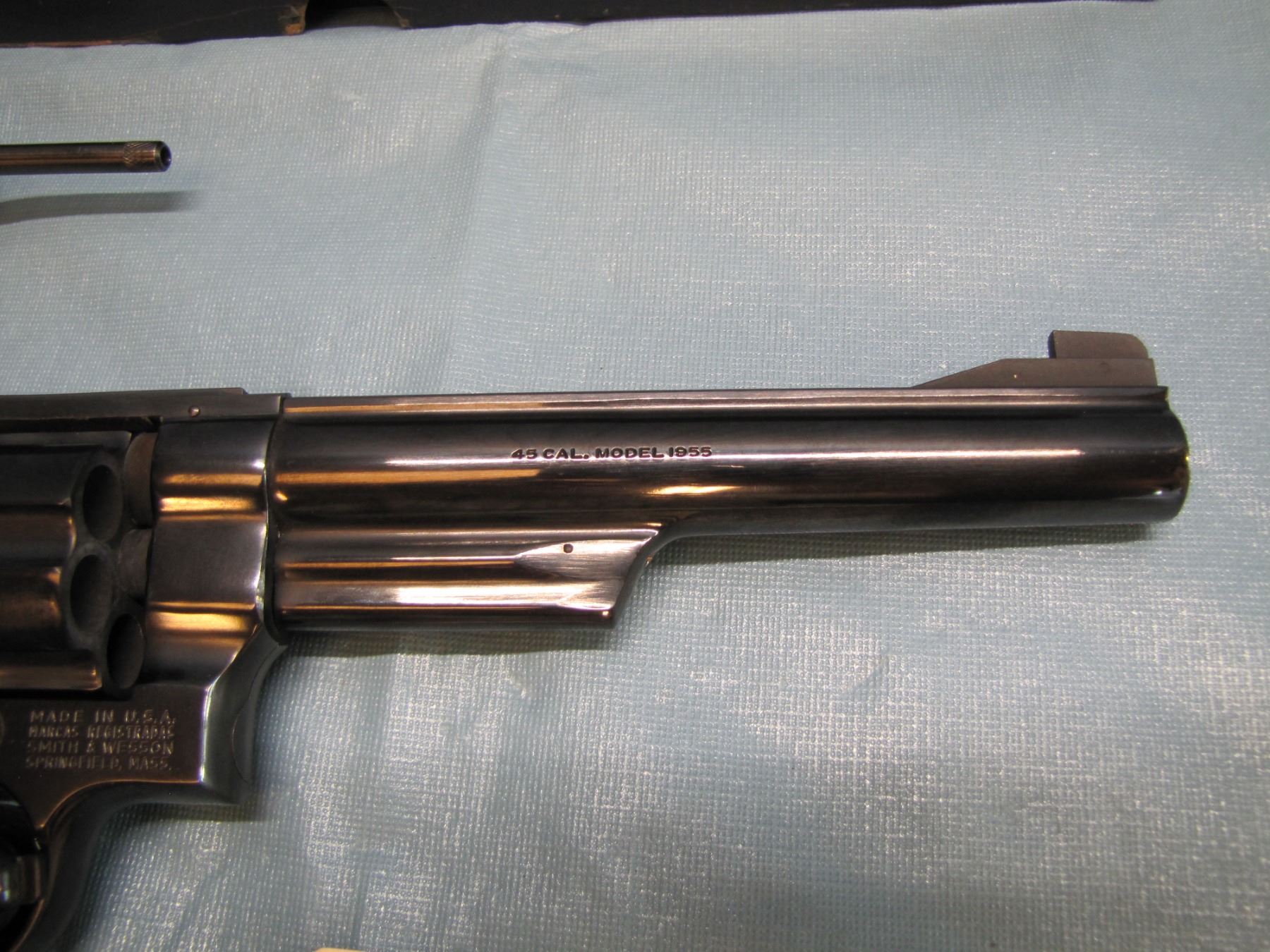 RESTRICTED: Smith & Wesson model 25 - 2 ; 45 acp in original box, with extra cylinder in 45 LC , functions as designed, 6 1/2" barrel, excellent bore, restricted ; serial number N 450142 ; - the model "25" was previously known as the "45 Hand Ejector Model Of 1955 Target"; it was re-designated as the model "25" in 1957 when Smith & Wesson adopted the policy of model numbers in place of names.