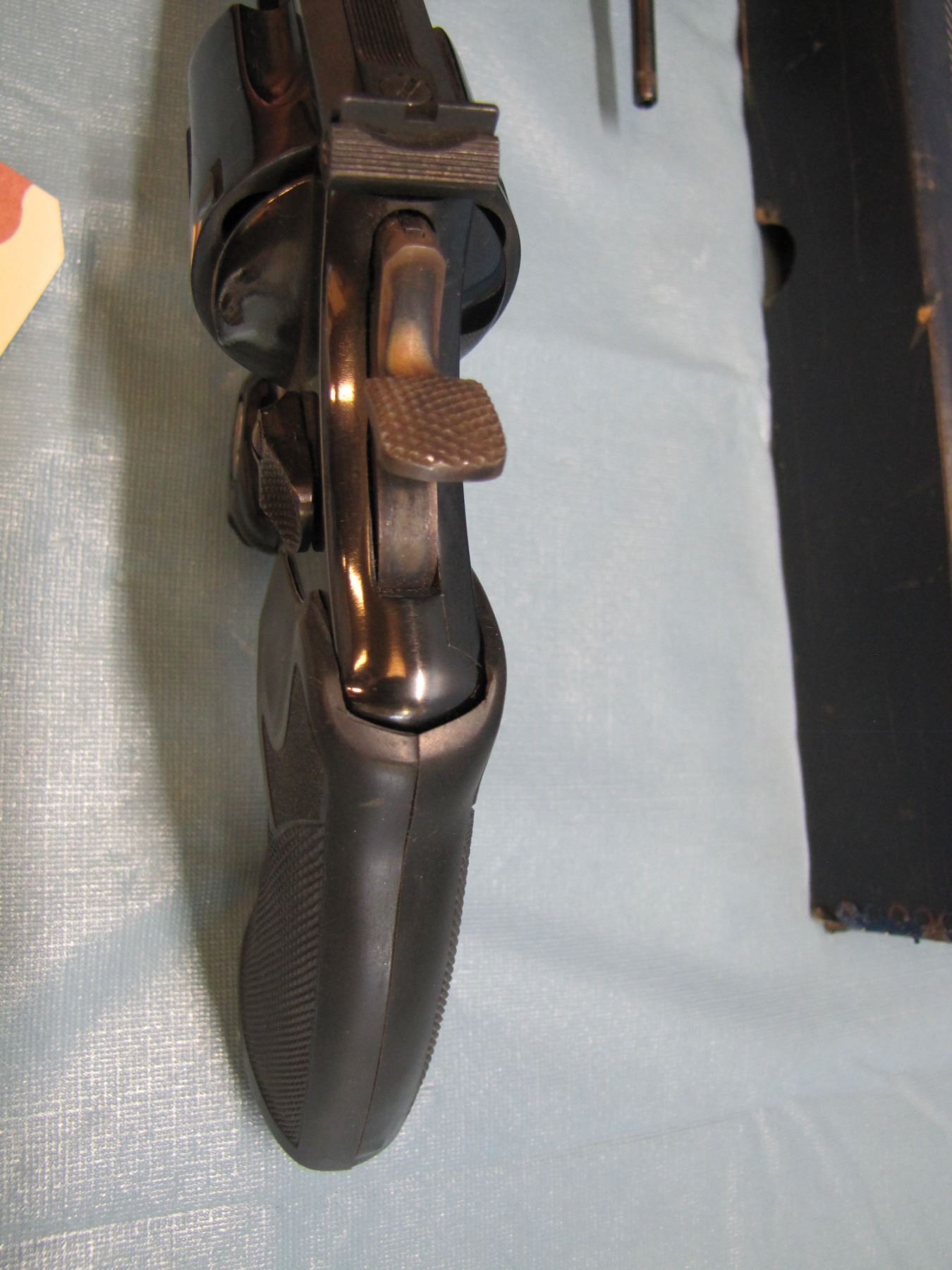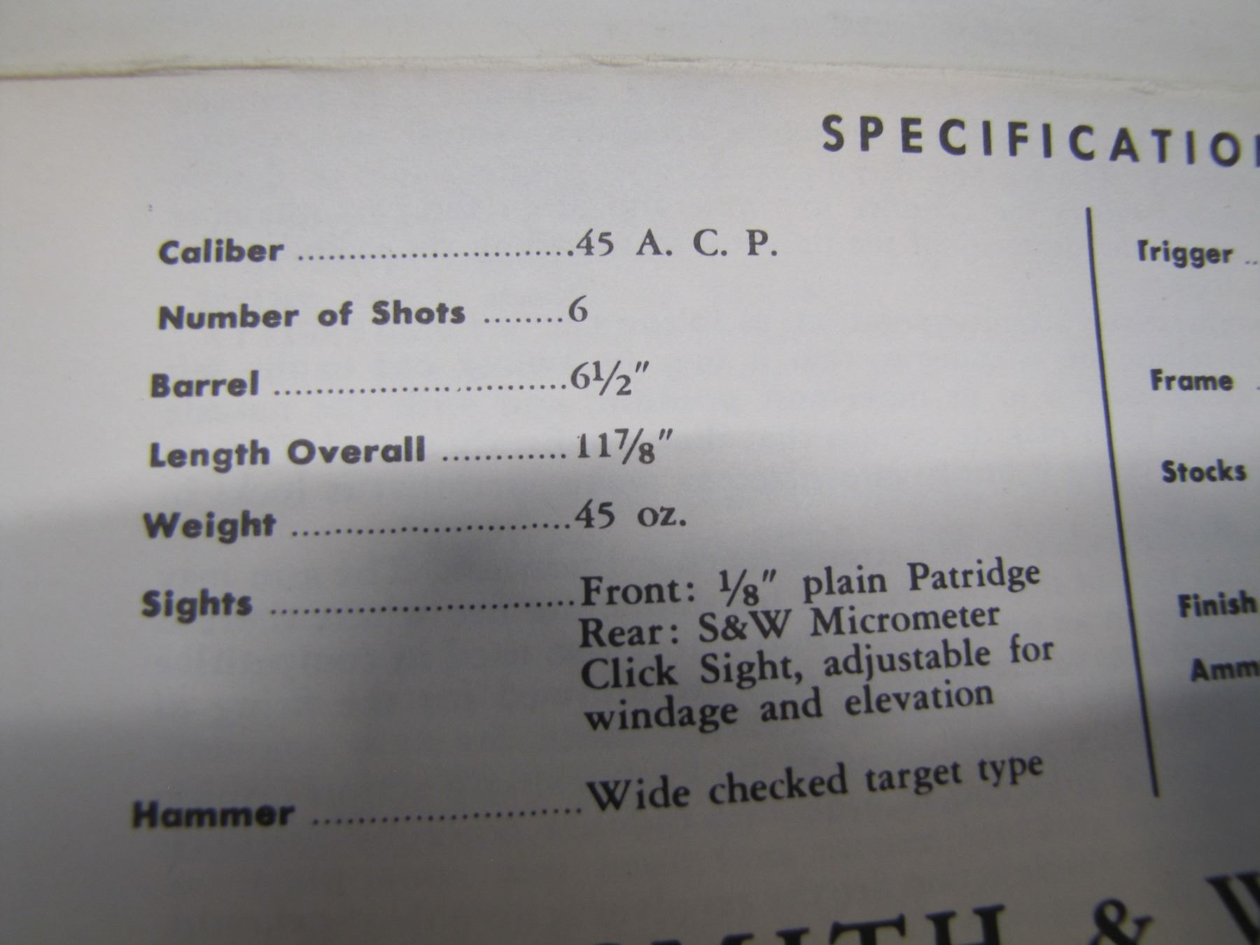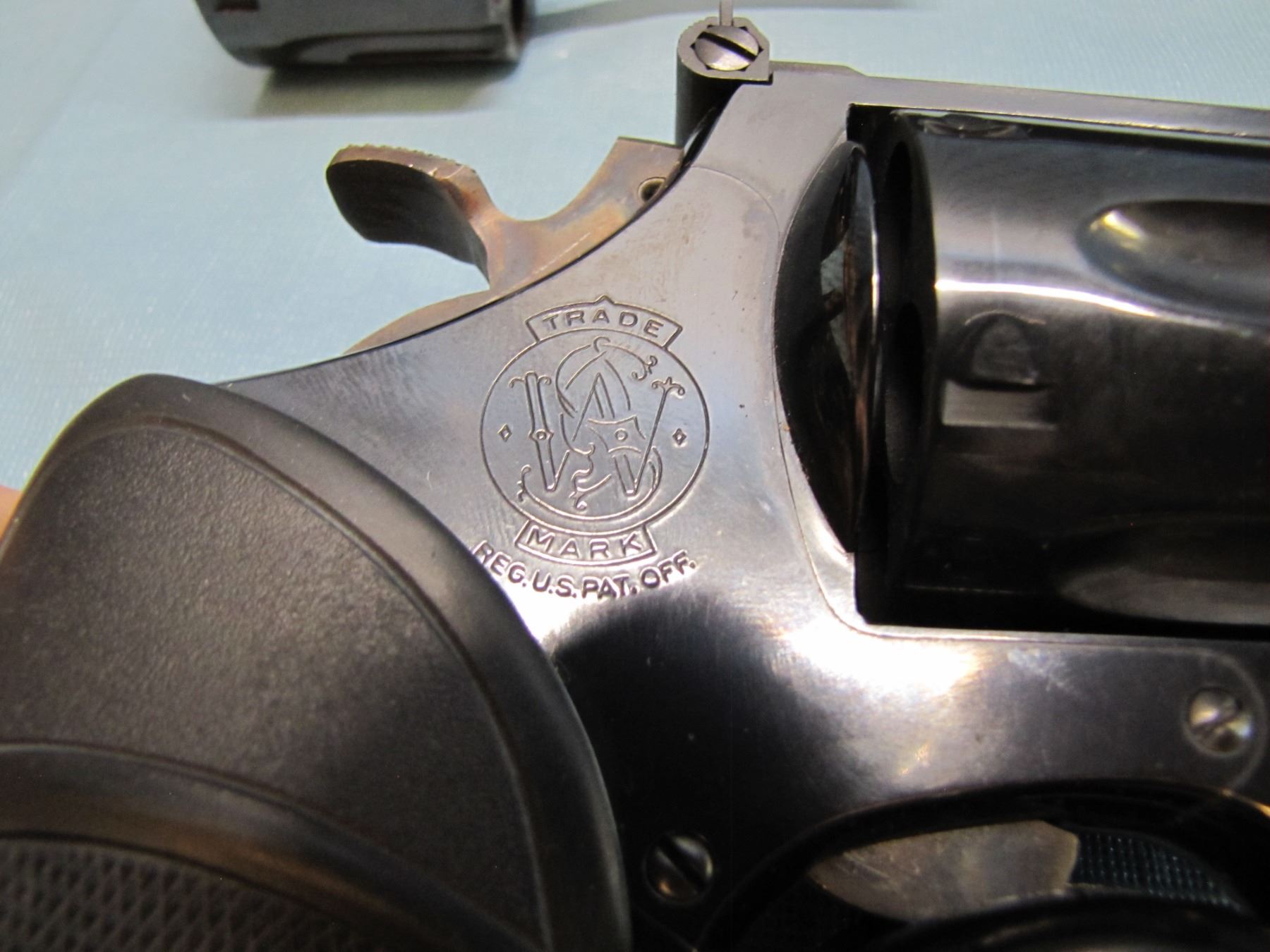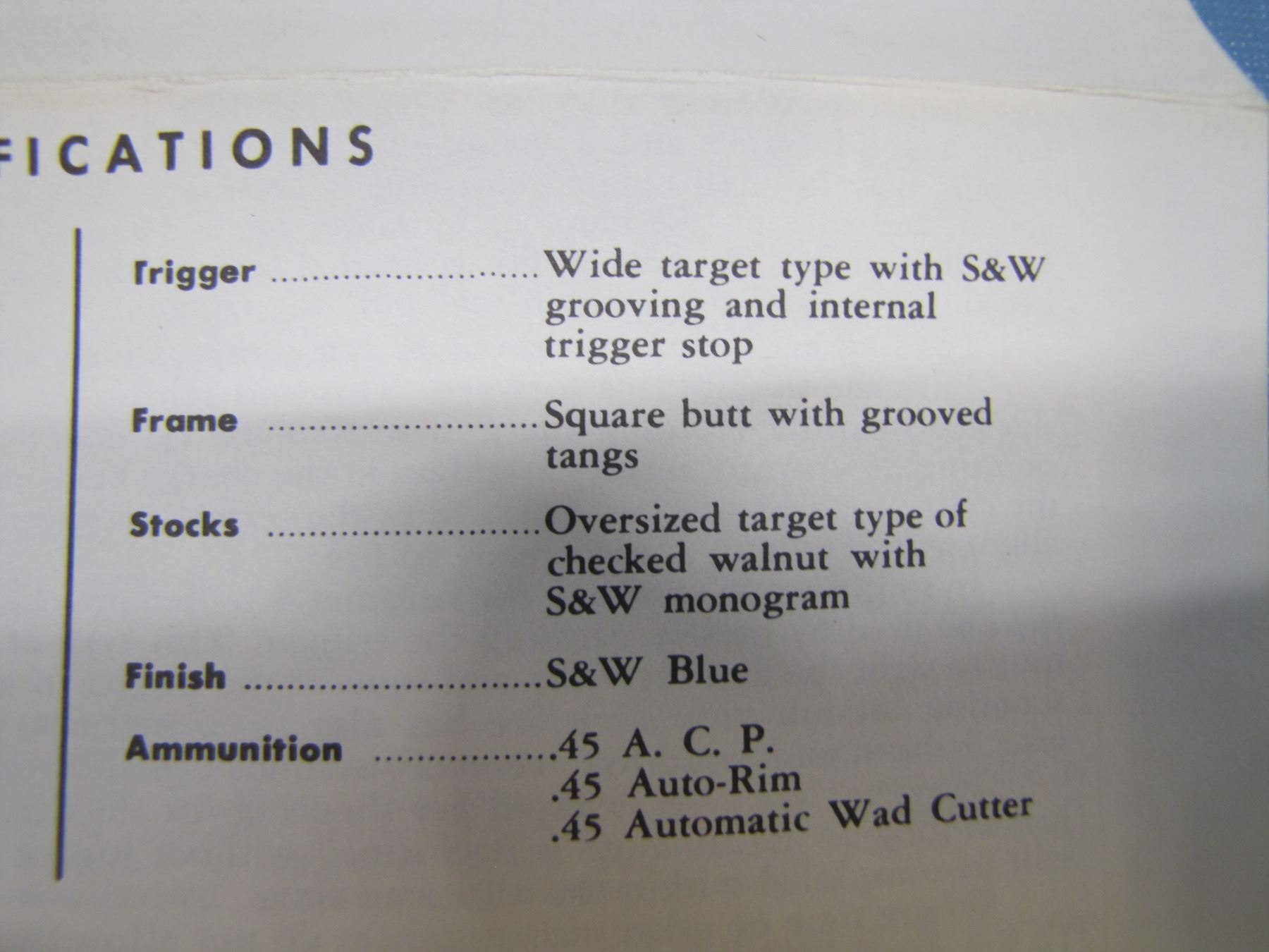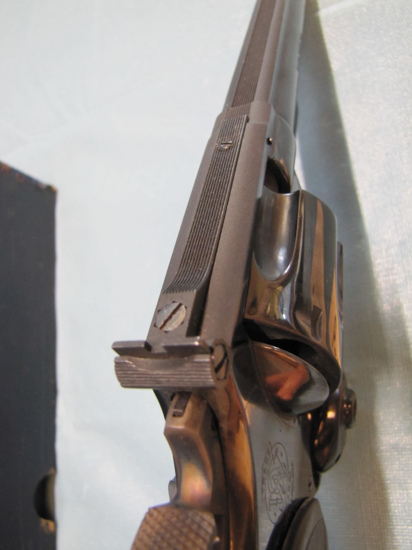 - features include: blued or nickel finish; fluted swing-out cylinder; round, heavy barrel with a top rib; checkered walnut grips; click-adjustable rear sight with a square-backed Patridge front sight; square butt profile; serrated frontstrap and backstrap; built on the "N" receiver/frame.