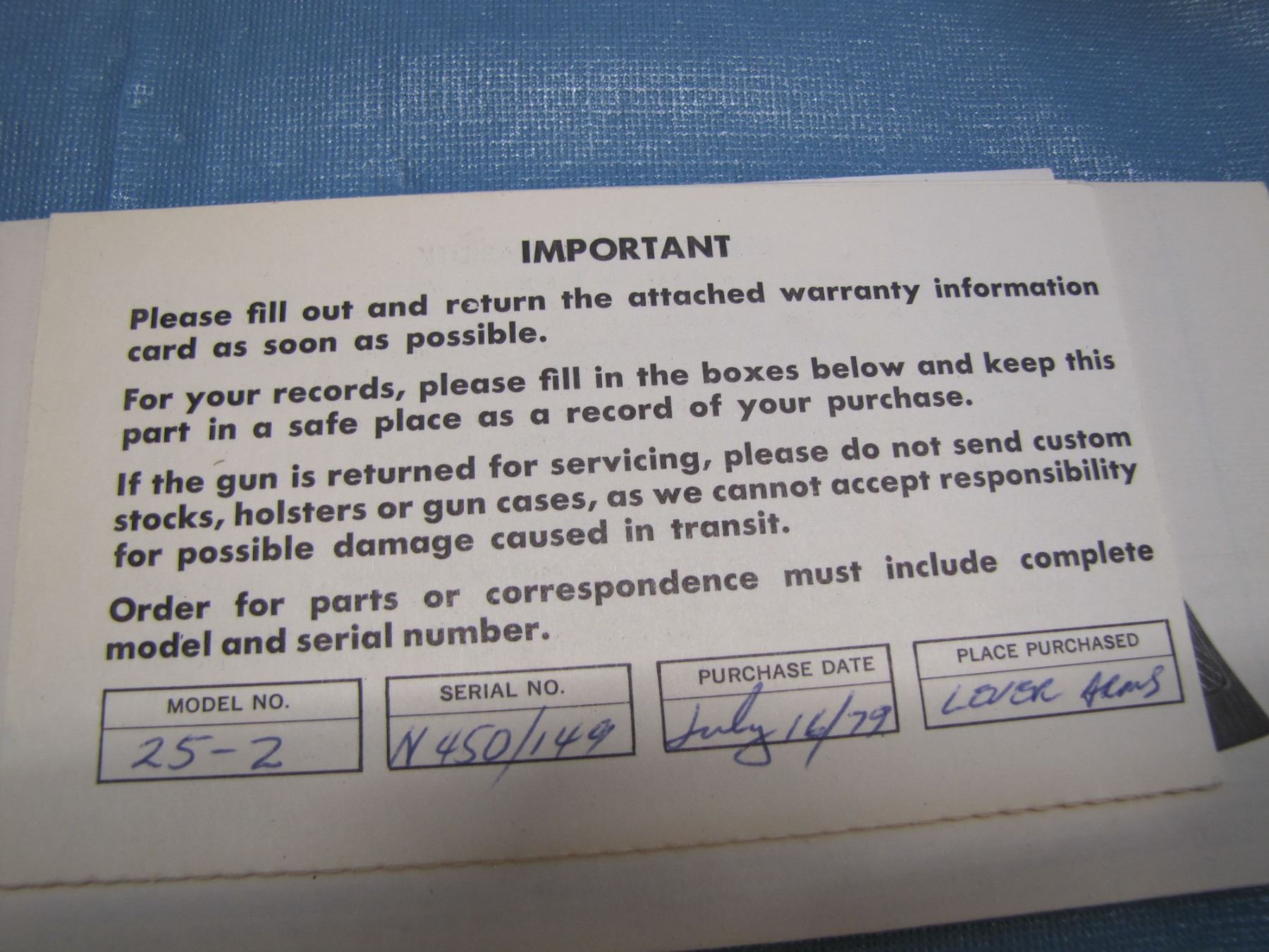 ALL GUNS SHOULD BE CHECKED BY A QUALIFIED GUNSMITH BEFORE FIRING - CATALOG IS A GUIDE ONLY - MEYERS AUCTIONS WILL NOT SUPPLY ANY BORE CONDITIONS FOR GUNS. ANY BORE CONDITIONS THAT ARE NOTED ARE SUPPLIED BY THE CONSIGNORS AND ARE NOT GUARANTEED. NO GUARANTEE AS TO CALIBER LISTED BEING RIGHT. USE YOUR OWN JUDGEMENT - IF IN DOUBT CHECK !!!