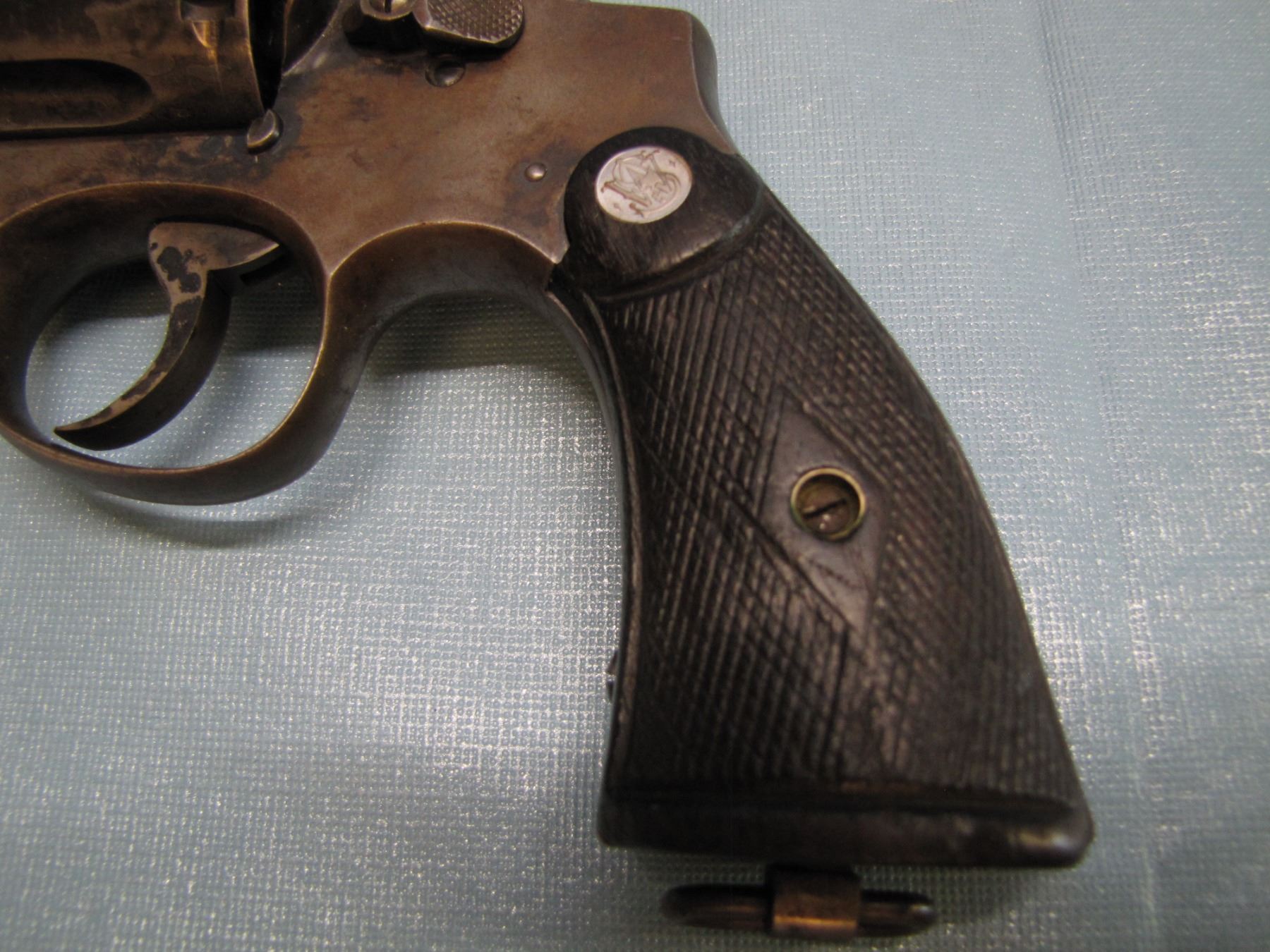 RESTRICTED: Smith and Wesson; model 11; caliber 38 Smith and Wesson cartridge; Barrel length 152MM; six shots; revolver; serial number 736424; - from 1938 to 1945, when this model was known as the "38/200 Military & Police" or "38/200 British Service" the serial range was from 700000 to 1000000