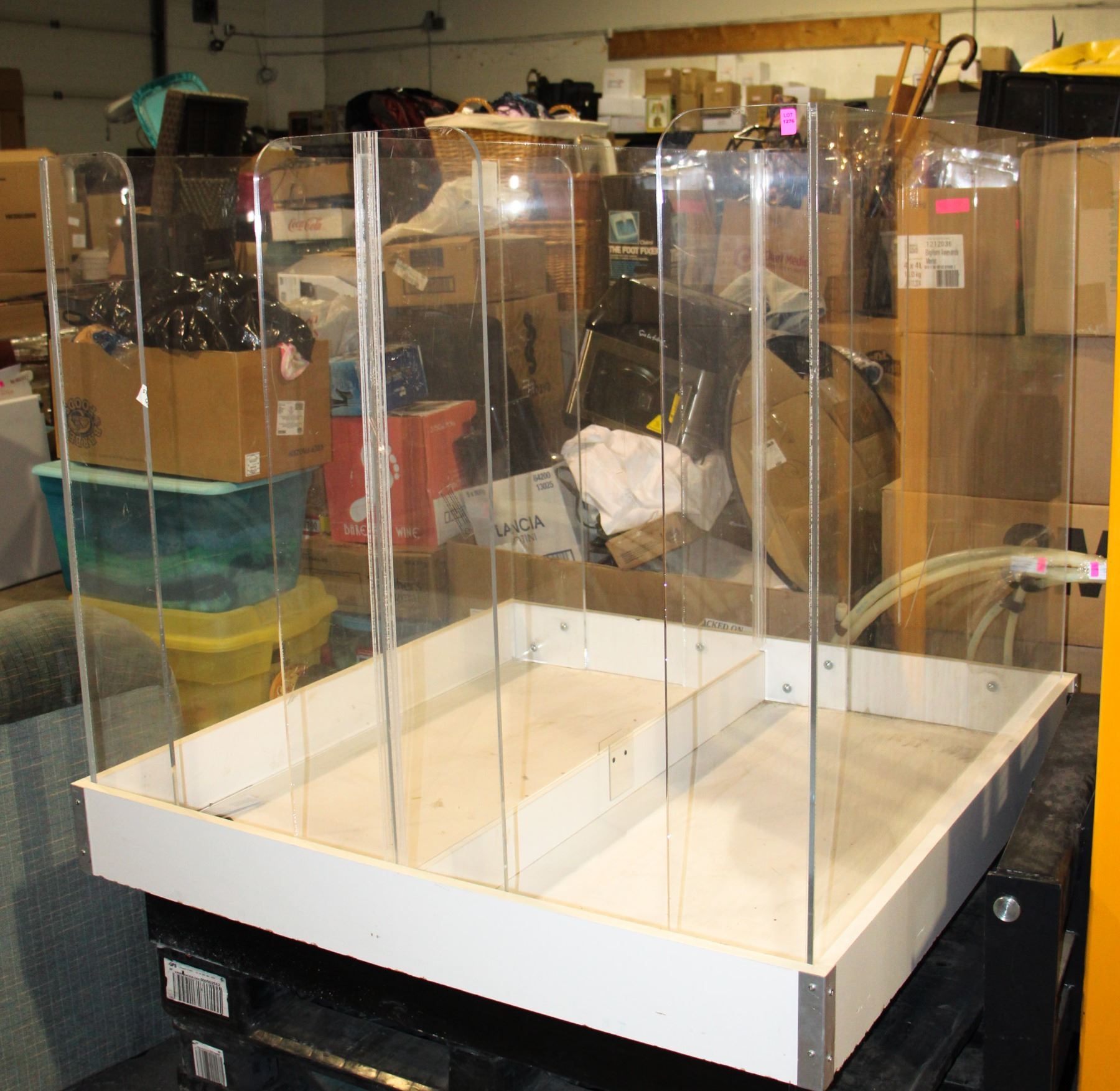 USE AS IS OR REPURPOSE CLEAR SECTIONS. APPROX 42" TALL X 45.5" X 45.5". PALLETS SITTING ON NOT INCLUDED