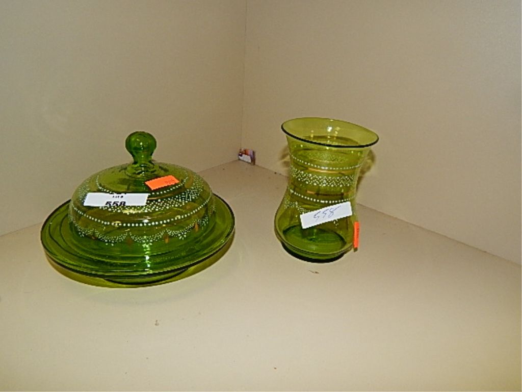 RETRO GLASSWARE - GREEN & GOLD - BOWL WITH LID & VASE