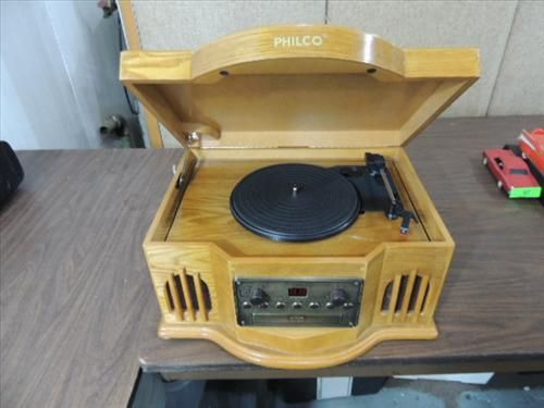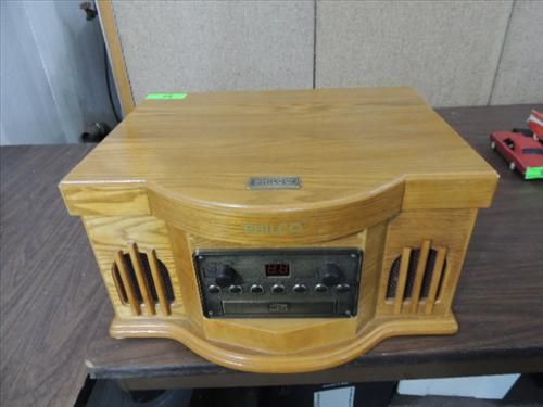 RETRO PHILCO COMBO CD, CASSETTE & LP PLAYER, OAK VENEER CONSTRUCTION. 19X16. AS SHOWN. VIEW PICTURE FOR DETAIL.