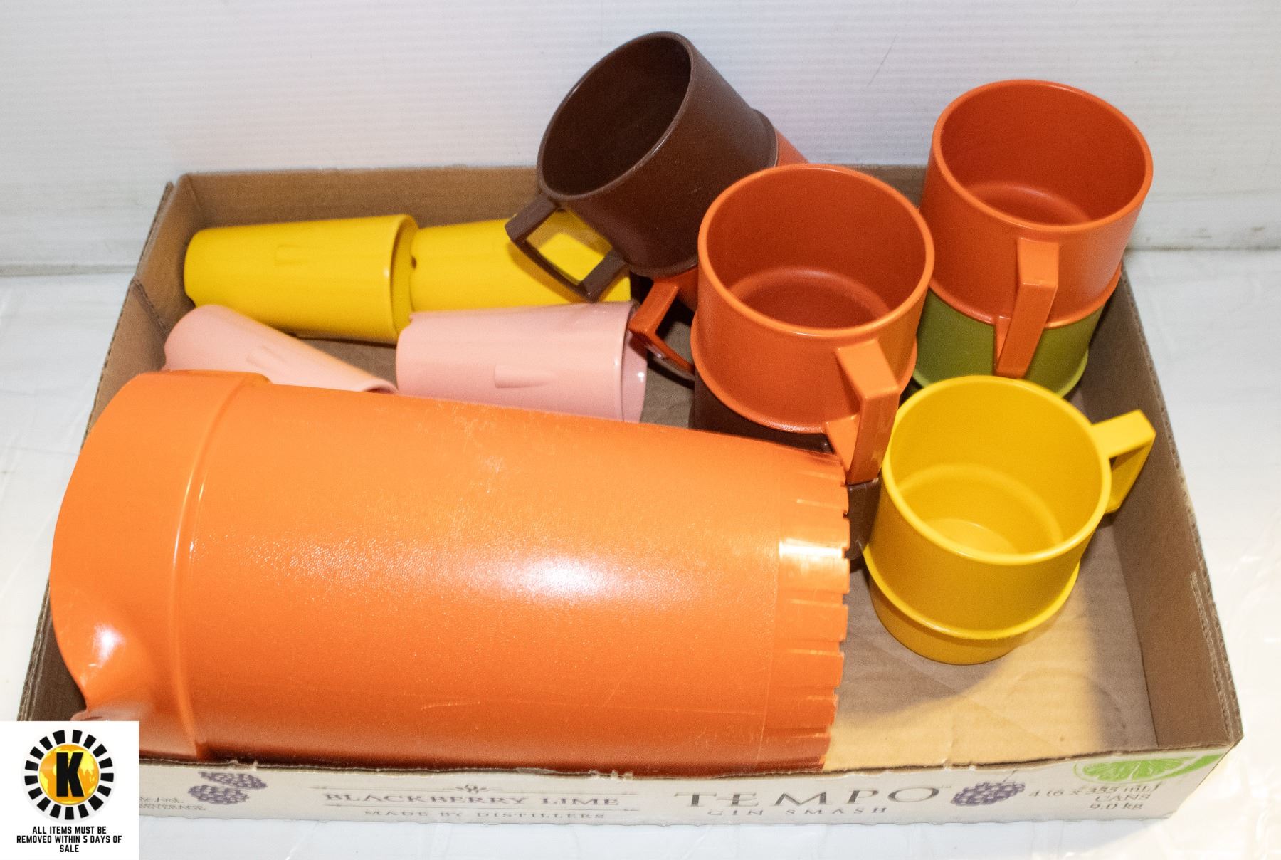 RETRO TUPPERWARE PITCHER, 7 MUGS & 4 MELMAC