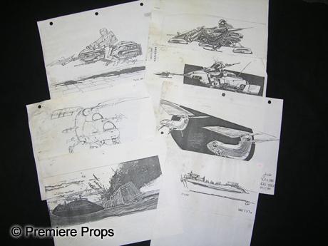 Return of the Jedi (1983) - Concept Drawings of Space Craft used in production. Here are copies of 7 drawings by Ralph McQuarrie and Norman R. Stamped "Received 4/17/81 L.F.L. 1981" - Include skiff, Sarlac pit (with crashed barge and skiff), Sicemon Taxis, Helicopter like craft, Land Scooters - Water Damage From a crewmember's private collection. (8.5x11)