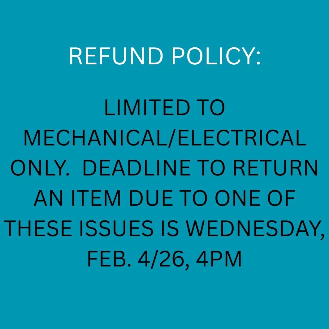 RETURN POLICY: Limited guarantee ONLY (if electrical/mechanical items are not working) valid until 4PM, WEDNESDAY, FEB. 4, 2026. No returns on "As Is" OR "Inoperable" items.