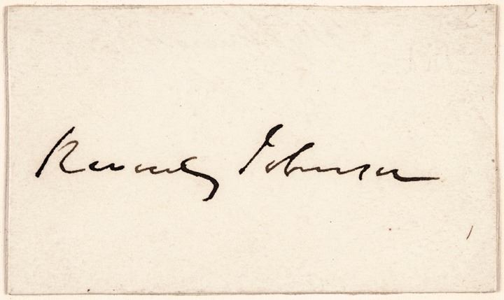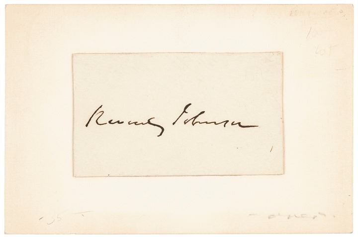 Original Autograph Signed, “Reverdy Johnson” the famous attorney who represented Mary Surratt at her trial as one of the members of the Abraham Lincoln Assassination Conspiracy in 1865, Choice Very Fine. Mary Surratt was accused of assisting John Wilkes Booth, her son John Surratt, and a number of others in the plot to first kidnap, and then to kill, the President at the end of the Civil War. Measures 2" x 3.5" on card, tipped to a larger 3.5" x 5.5" card with normal light age for display. Said to be from an old New England Autograph collection. Very rare when you want to find an example of this historic Trial Lawyer who’s famous legal cases included the Dred Scott case and Mary Surratt’s defense.