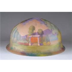 Lot 856 REVERSE PAINTED LAMP SHADE Reverse painted shade has helmet shape with reverse painted decoration of trees, a covered bridge and a park-like setting. Artist signed “G. Morley”. SIZE: 13-3/4” dia. CONDITION: Some minor chipping to top hole, otherwise very good. 5-71524