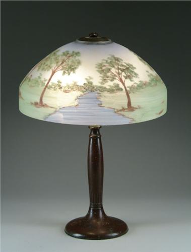 REVERSE PAINTED LAMP. Nice reverse painted table lamp has trees, meadow and stream encircling the shade. The summertime trees with green leaves are set against a background of blue shading to frosted. Shade rests on simple stick base with two socket cluster. SIZE: Shade is 16 in. dia. Overall height is 21-1/2 in. CONDITION: A couple of small chips to inside rim of shade, base has some wear to finish and sockets are replacements. Estate of Edwin Schiebel Sr. 5-60031