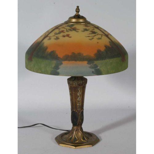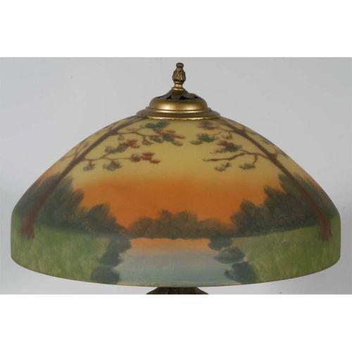 REVERSE PAINTED TABLE LAMP 15 1/2" diameter, unsigned circa 1925, CONDITION REPORT: some paint loss to base, PACKING AND SHIPPING: Fairfield Auction will provide packing and shipping (excluding insurance) within the Continental U.S. for $40. Buyer is welcome to use any other service or pick-up at the gallery.