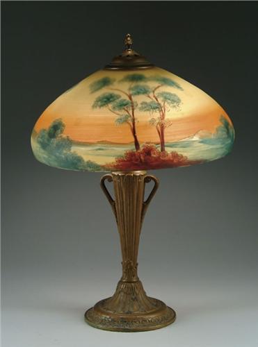 REVERSE PAINTED TABLE LAMP. Very nice reverse painted shade has lovely green trees against an orange sunset background. Mountains are visible in the distance. Shade is numbered on the inside "91915" and rests upon a cast metal urn shaped base with double socket cluster. SIZE: Shade is 16 in. dia. Overall height is 23 in. CONDITION: Small chip to inside bottom rim of shade and some wear to finish on base, otherwise very good. Estate of Edwin Schiebel Sr. 5-60004