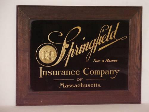 REVERSE PAINTING ON GLASS ADVERTISING SIGN "SPRINGFIELD FIRE and MARINE INSURANCE CO. OF MASSACHUSETTS" W/ OAK FRAME (19 3/4" X 27 3/4") - MINOR WEAR TO FRAME;