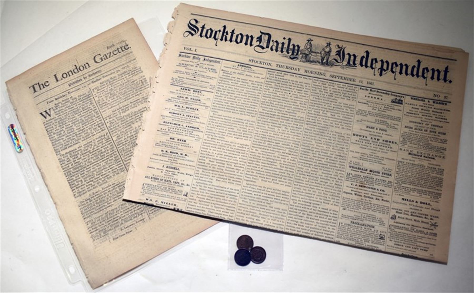 LONDON GAZETTE NOV-27 THRU NOV 30 1773, STOCKTON DAILY INDEPENDENT SEPT 12 1861 & 3-CIVIL WAR TOKENS ESTIMATE $120 - $140.