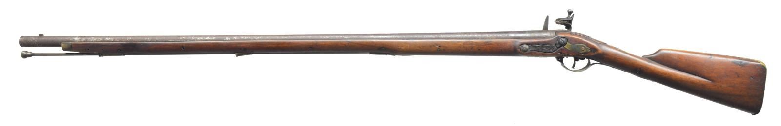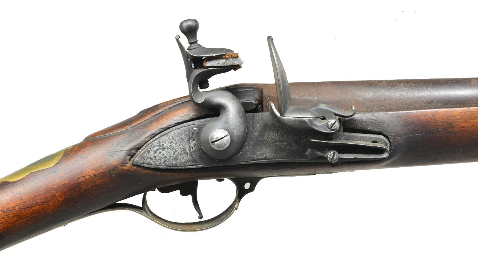 MUSKET. Cal. 69. NSN. Bbl. 40" rnd., totally unmarked, assembled w/ mix of British style 18th century Brown Bess & other furniture, carved molding rear of tang. CONDITION: good to very good overall, lock hardware including cock, frizzen, & frizzen spring are restored. 2nd Model Brown Bess style sideplate has leather & rnd. brass screw escutcheons used where front portion missing. Brass buttplate, wrist escutcheon, trigger guard, & ramrod pipes have mixed medium mustard patina. Nose cap & ramrod are replacements. (01-18756/JS). ANTIQUE. $2,000-3,000.