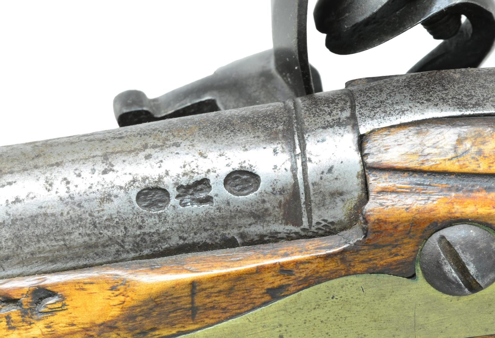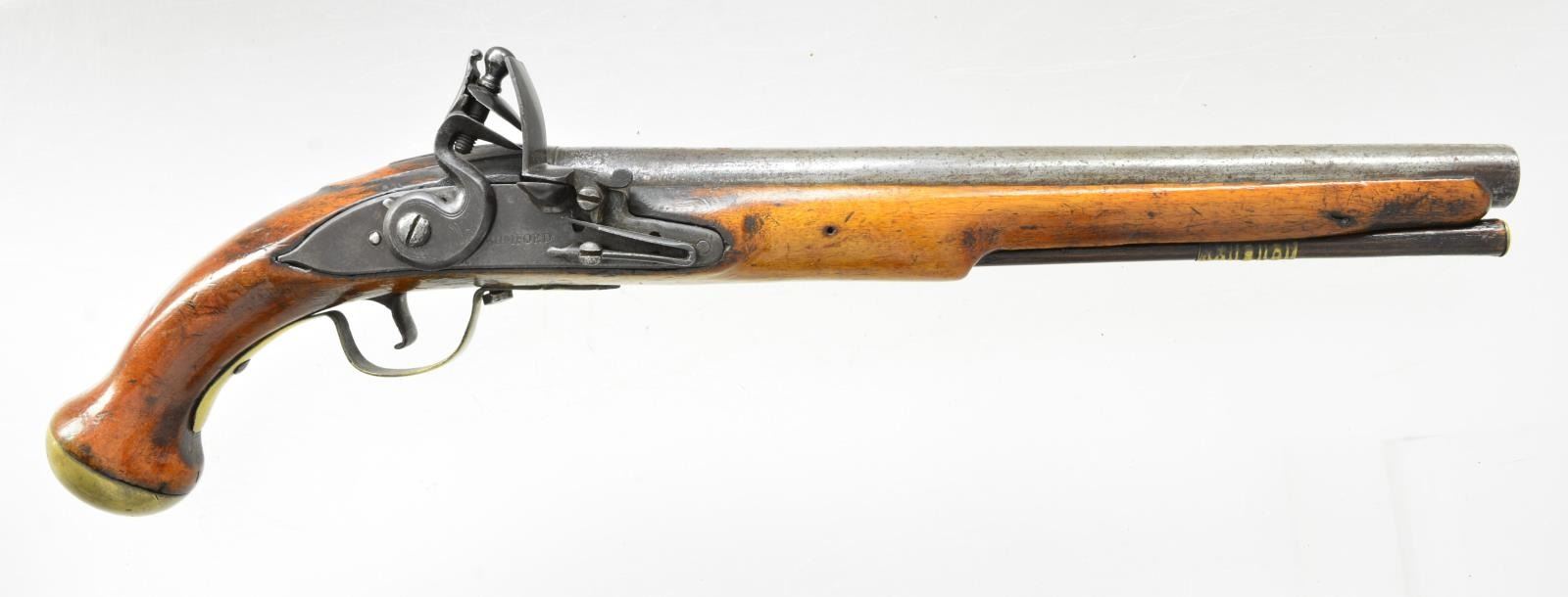 PISTOL, CIRCA 1750. Fine example of 65 caliber. NSN. 19" Overall. Bbl. 12", London proofed brass mounted horse pistol. An identical example shown made by John Bumford on page 27 of British Military Pistols by Brooker, 1978. Flat unsupported cock w/ minimal engraving, faceted pan, unbridled frizzen, sideplate w/ 3 screws, single fluted brass ramrod pipe, ramrod w/ integral iron worm & brass capped tip. CONDITION: very good overall, original & complete, mechanically fine w/ smooth pitted bore. PROVENANCE: From the Collection of John "Tim" Breth Jr. (01-17763/JS). ANTIQUE. $1,200-1,500.