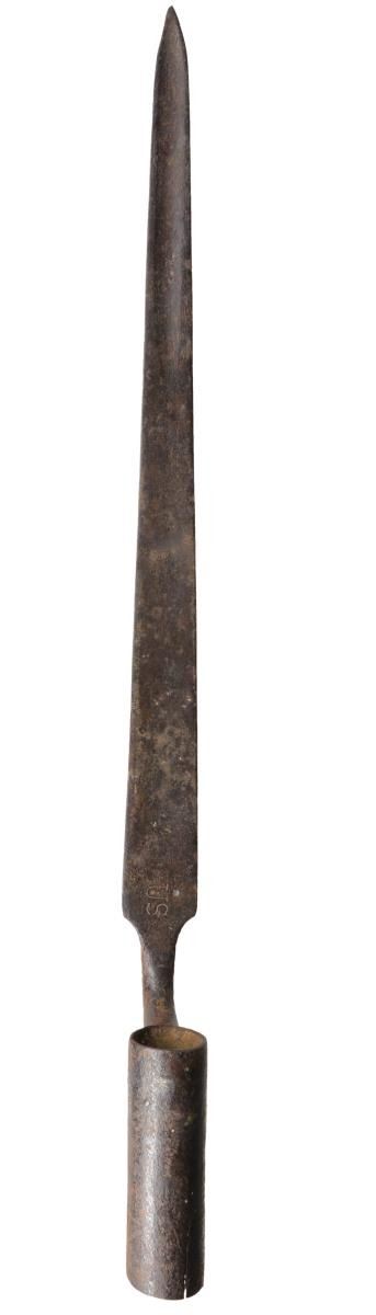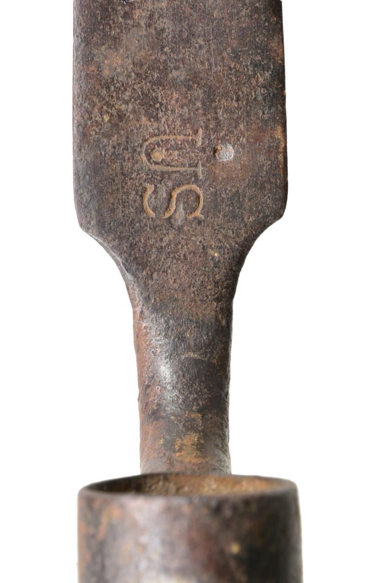 BAYONET. 17" Overall. 13" Blade, 1 1/16" wide w/ 3/8" high letters in surcharge. Revolutionary war & federal era surcharged bayonets are quite rare. This is an honest example w/ rich patina. CONDITION: good to very good overall, a couple sm. light bends on either flange, about 1" crack in socket. PROVENANCE: From the Collection of John "Tim" Breth Jr. (02-13791/JS). $800-1,200.