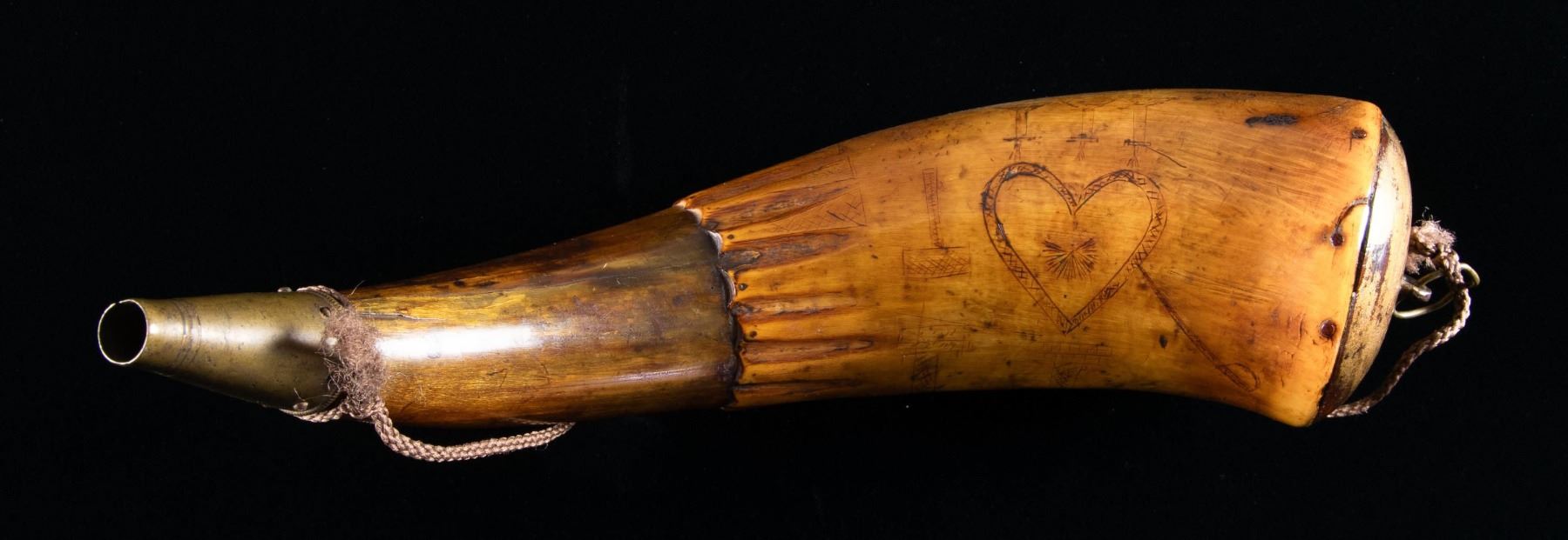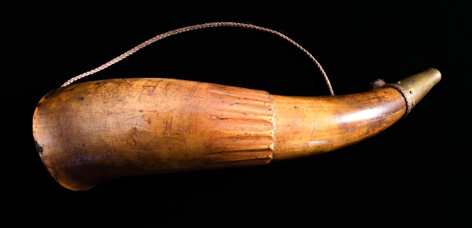 HORN. 10" nicely patinaed fully scrimshawed horn "SAMUEL ADAMS", heart & sword, anchor, masonic trident. CONDITION: good to very good overall, worn decoration. PROVENANCE: The Esteemed Norm Greenberg Collection. (02-24847-9/JS). NON-GUN. $1,000-2,000.