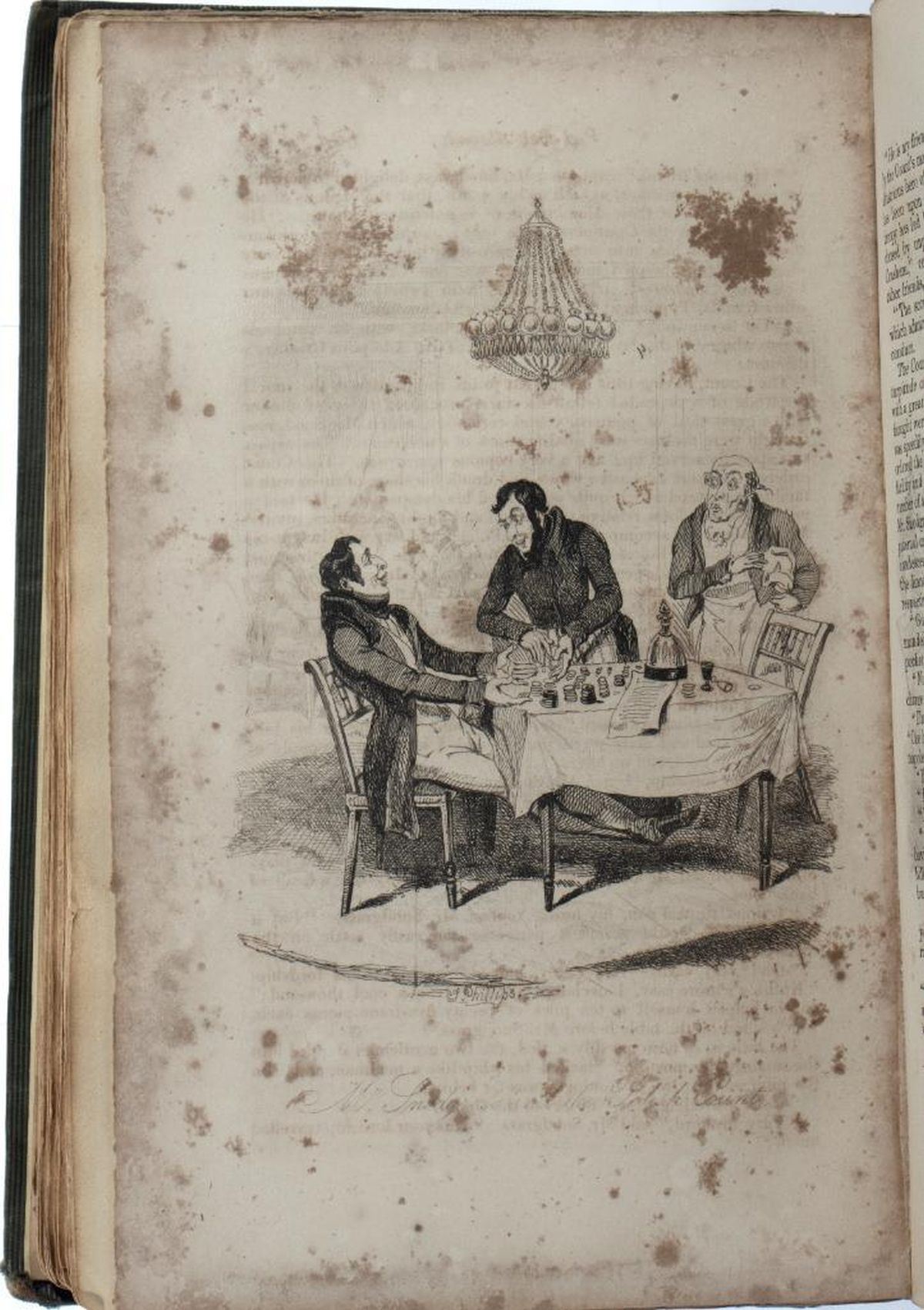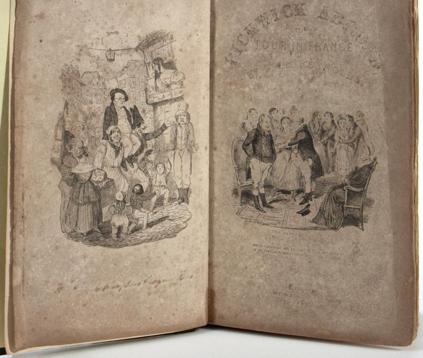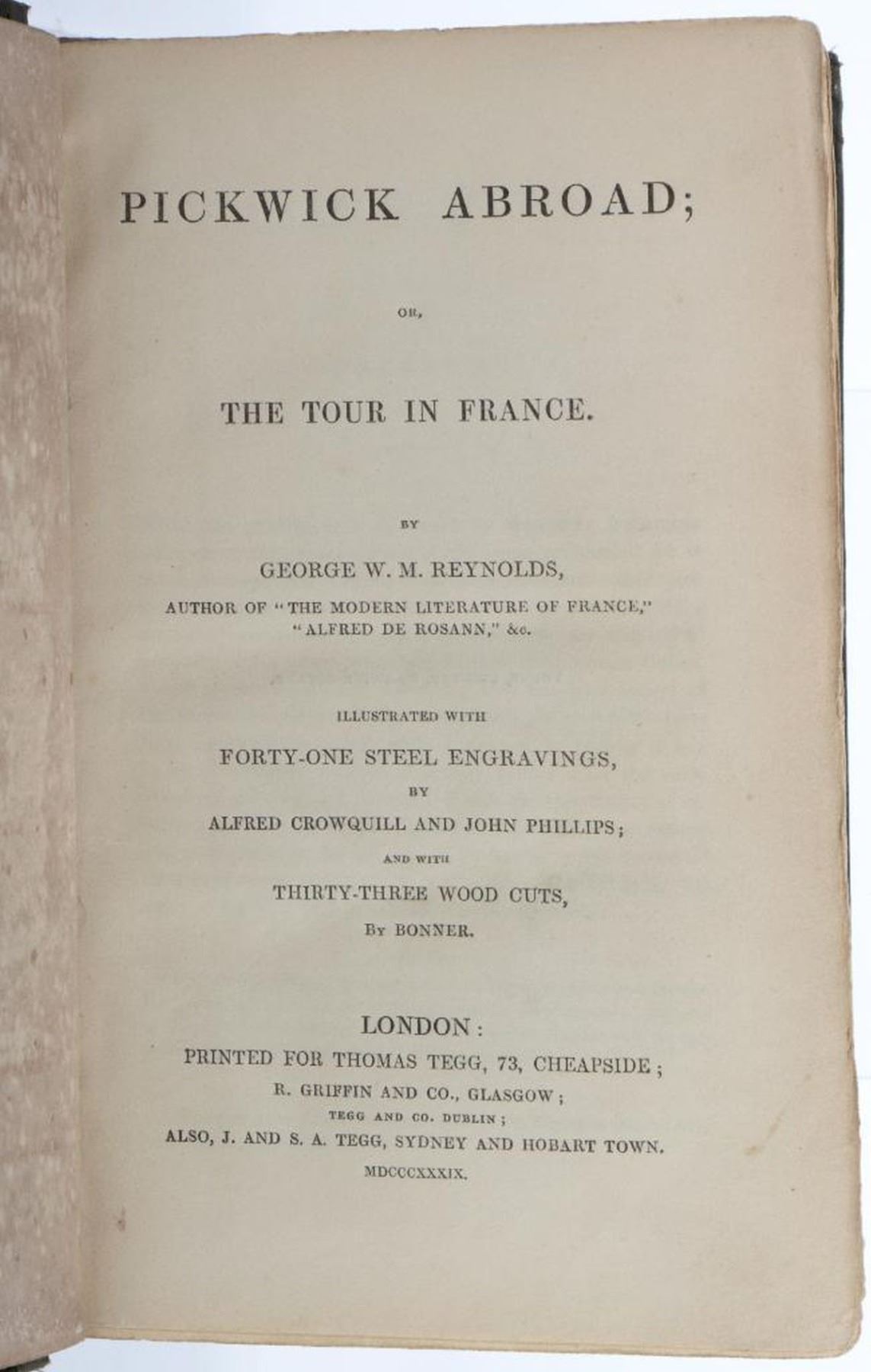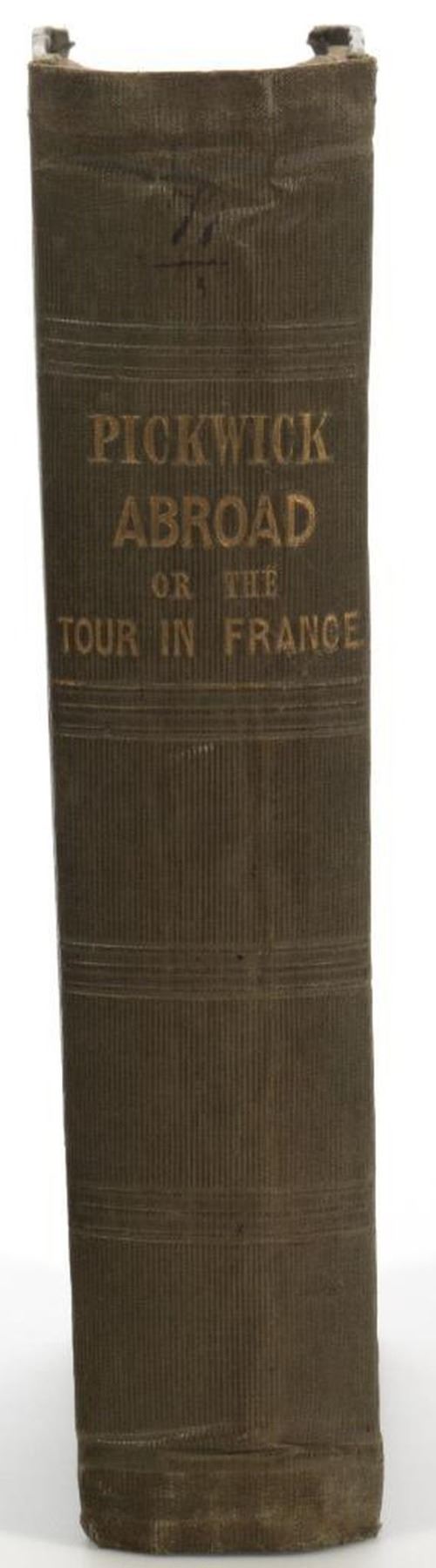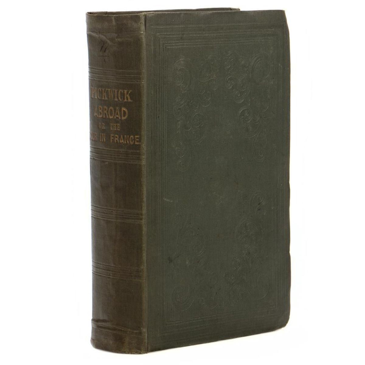 Pickwick Abroad; or, the Tour in France. London: Thomas Tegg; Glasgow: R. Griffin and Co.; Dublin: Tegg and Co.; Sidney and Hobart Town: J. and S. A. Tegg, 1839. 8vo. Original linear ribbed, blindstamped green cloth, embossed bands and gilt to spine, light yellow endpapers (appear to be replacements). Illustrated with Forty-one Steel Engravings, by Alfred Crowquill and John Phillips; and with Thirty-three Wood Cuts, by Bonner. Engraved title page, and facing engraving titled "Mr. Pickwick's Triumphant Entry to Paris." Includes Preface with quoted reviews. Good-Very Good. The spine is bumped and slightly faded, gilt of lettering still fairly bright, a faded handwritten number (?) on the spine above title; slight staining and rubbing mostly to the back cover, small buckling of the cloth on front cover, corners bumped and slightly worn. The illustrated title page and facing engraving are very toned/foxed and somewhat faded (mostly the text within the engravings). Throughout, the text pages are mostly clean, with the engraving pages are all toned/foxed to varying degrees, some considerably. The yellow endpapers are very clean.