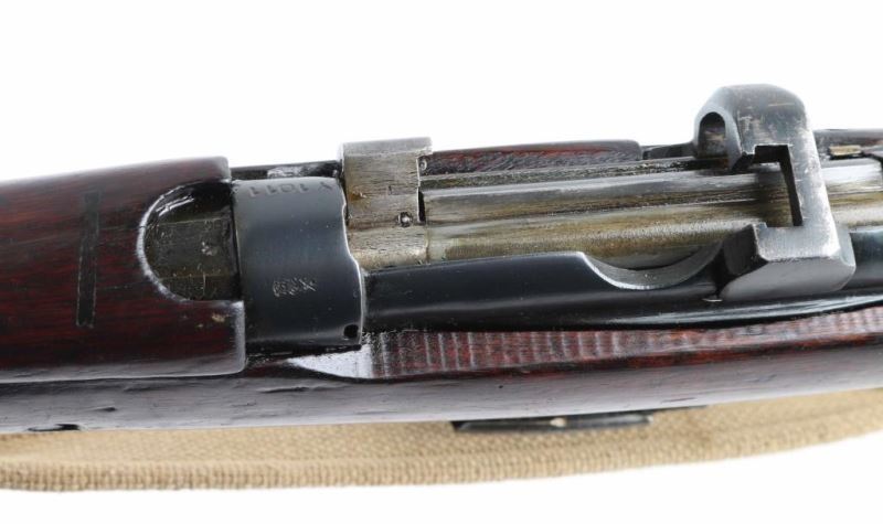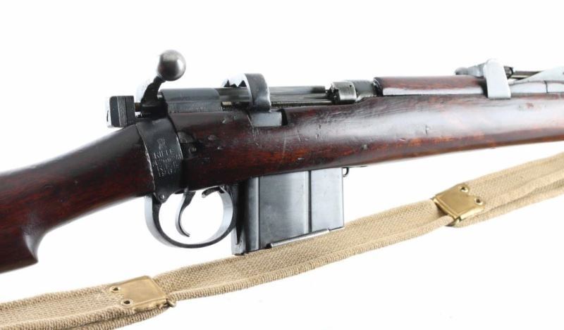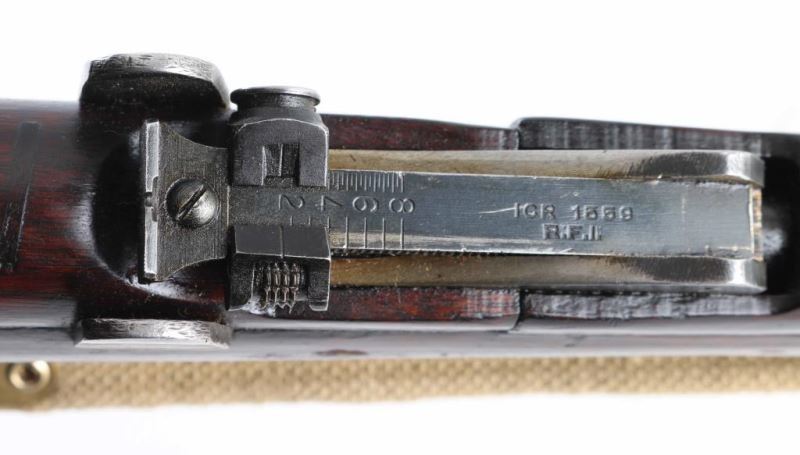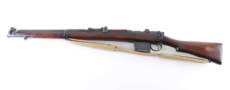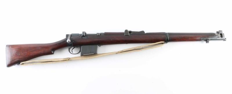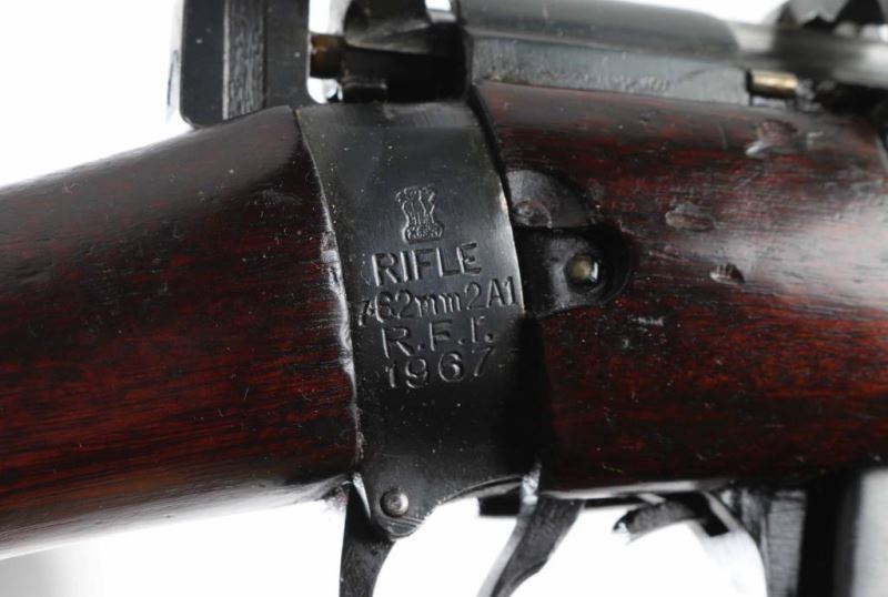 Indian military bolt action rifle dated 1967, manufactured at Rifle Factory Ishapore, imported by NAC, Ridgefield NJ. Features 25" barrel, bayonet lug, protected post front sight, adjustable rear tangent sight with protective ears, 10 round detachable magazine, stripper clip guide bridge, manual safety, sling swivels, two piece wood stock with straight grip, aluminum buttplate with trap door storage compartment. Bore is good condition, dark grooves with strong rifling. Metal retains 80% blued finish, turning gray on nosecap & rear sight, showing bare metal on sharp edges & high spots. Wood is very good condition, with many dents and scratches. Painted numbers on left side of butt mostly removed, leaving slight trace and showing slight loss of finish. Serial number repeated on nosecap. Includes very good condition tan cotton web sling. Condition is NRA Very Good *** C&R Firearm ***