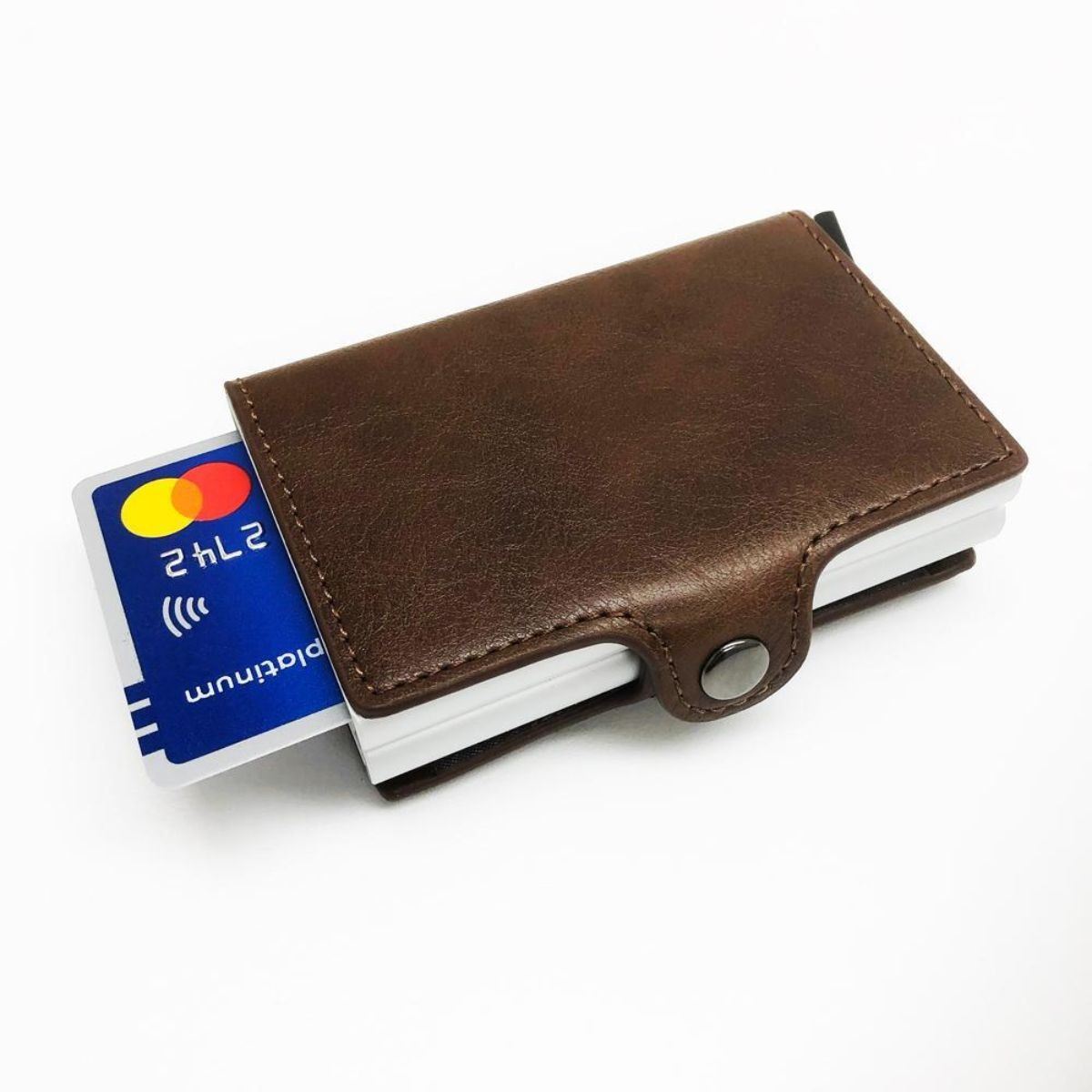 RFID Leather Wallet with Card pop out Mechanism. This Wallet Protects Credit and Bank Cards From Scan Fraud. Unique Pop Out Lever Card Dispenser. View Photos For Further Details.
