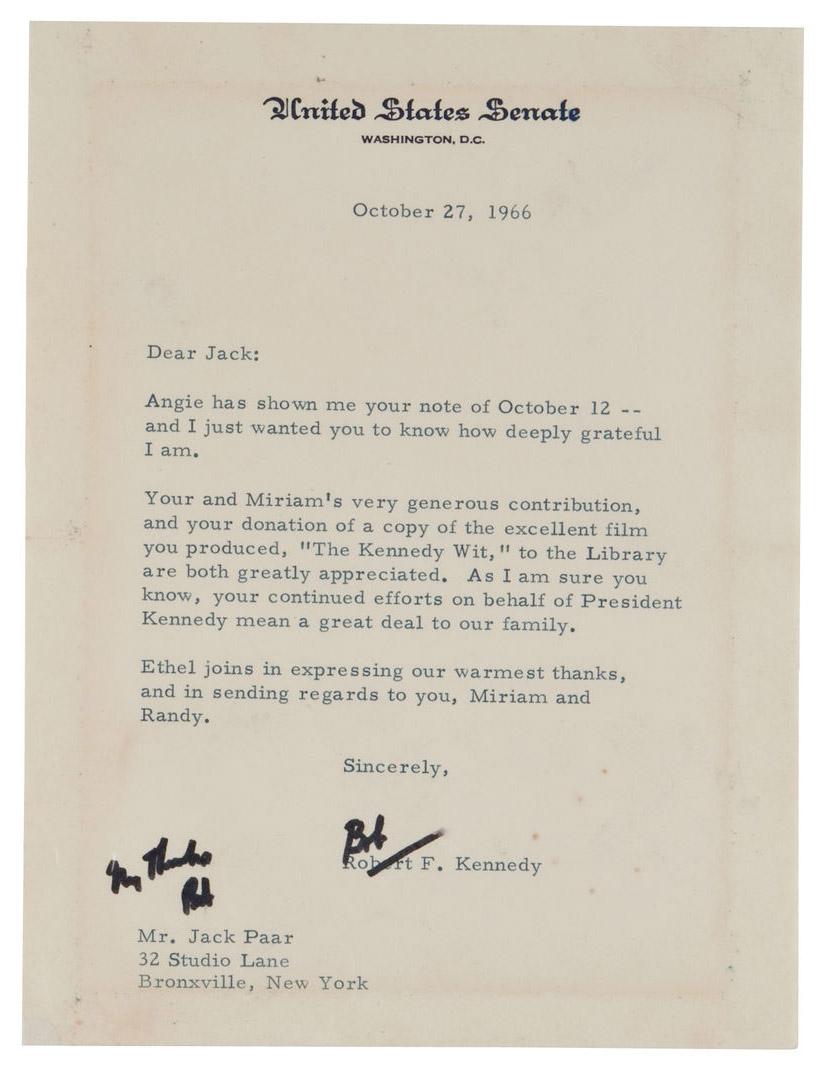 Robert Kennedy typed letter twice-signed ''Bob'' in bold ink, dated 27 October 1966 on U.S. Senate stationery. Letter is addressed to ''Tonight Show'' host Jack Paar and reads in part: ''…Your and Miriam's very generous contribution, and your donation of a copy of the excellent film you produced, 'The Kennedy Wit,' to the Library are both greatly appreciated…'' Signed ''Bob''. Above Paar's address, Kennedy has additionally written in bold ink, ''My thanks / Bob''. Letter measures 6'' x 8.25'' on one page. Minor toning else near fine.