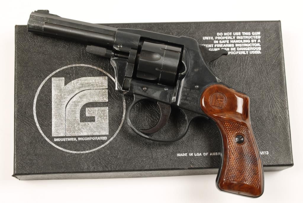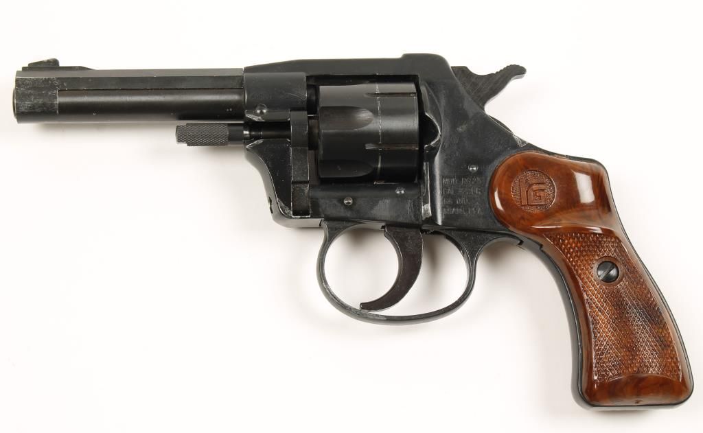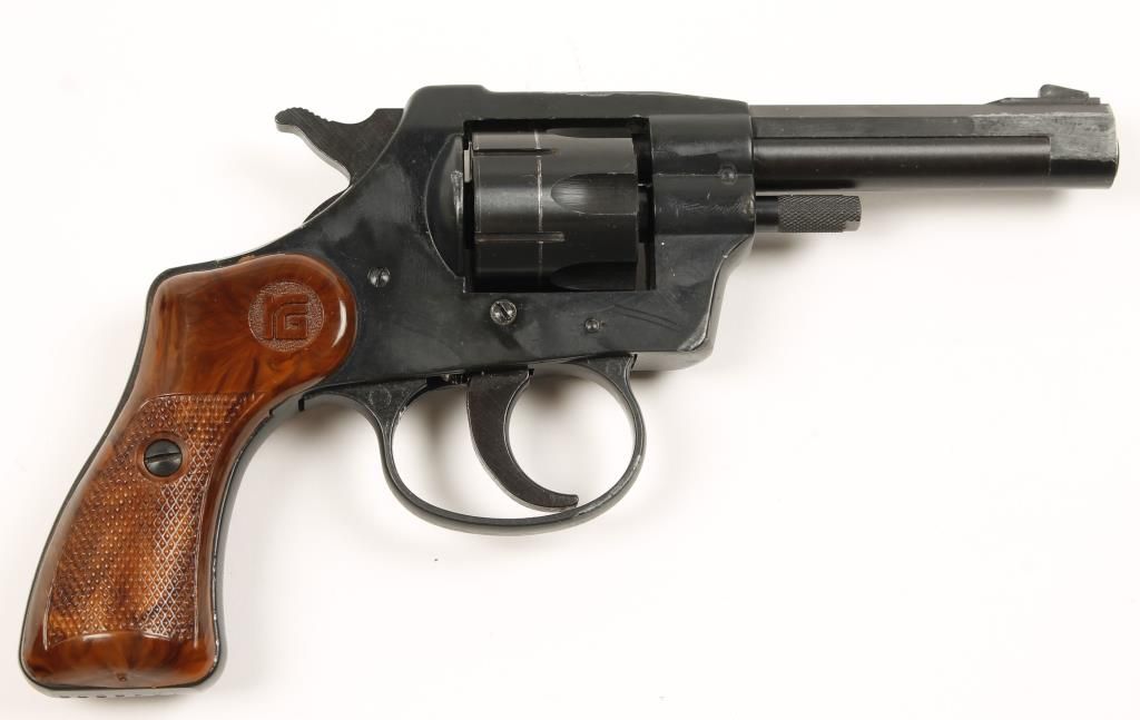 Double action 6 shot rimfire revolver with 3-3/8" barrel. Blued finish, checkered, wood grain plastic grips, swing out cylinder and fixed sights. Good bore and fair action. Includes original box and manual. Condition: Good overall showing bluing wear near the muzzle and high point wear. *Modern Firearm*