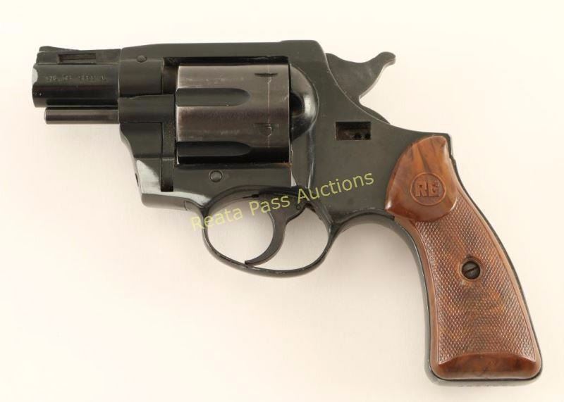 German made snub-nosed double action revolver chambered in .38 Special. Features a blued/black finish, 2" steel barrel with a vent rib shroud, ramp front sight, square notched rear sight, fluted six-shot swing out cylinder, smooth trigger, serrated hammer spur and RG two-piece checkered faux wood plastic grips. Revolver retains approximately 85% of it's original finish showing dark rust & wear on the cylinder and high edge wear on the frame & barrel. It's also missing the cylinder release thumb piece. Action is strong with solid lock-up, bore appear excellent with what looks like dried grease and plastic grips are fine. Condition is good. ***Modern Firearm***