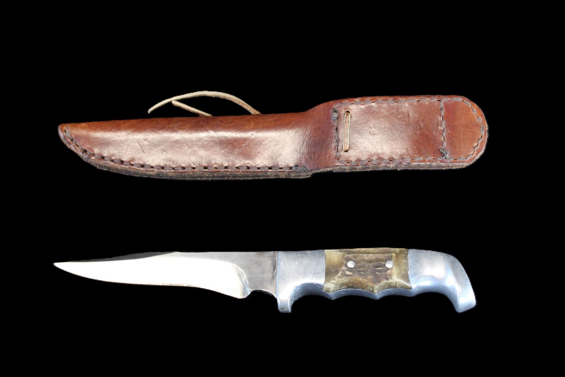 RH Ruana Bonner Montana Knife "M" Stamp- Sheath- Ruana Engraved- 5.5" Blade- 4.5" Handle- Hammered Condition- The Story Goes That This Was Rudys Personal Knife That He Used To Cut Leather For Sheaths In The Shop For Years And Years