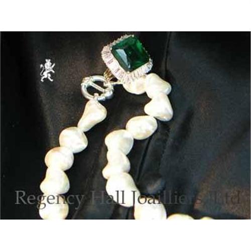 These exquisite Baroque beads are started as real shell, then coated with a manmade nacquer with beautiful lustre. They are a gorgeous soft white, have the weightiness and cool feel of their genuine counterpart, but not the price. These beads are approximately 1/2" long and the necklace is 18". The clasp is solid Sterling Silver. The center piece is a Solid Sterling Silver ball set with cubic zirconium.