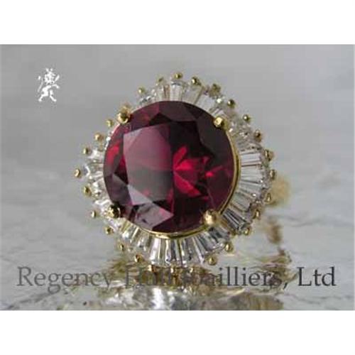This Synthetic Ruby was cut from manmade corundum. Corundum is the material the natural stones are made from inside the earth, so our synthetic has the same physical and optical properties as the natural. The side stones are Cubic Zirconium baguettes.