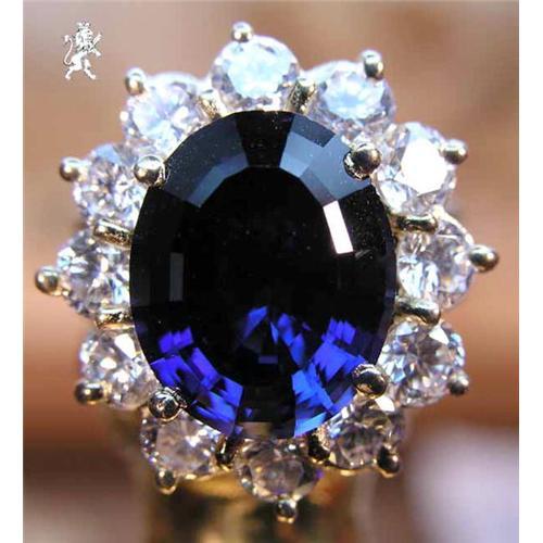 Read this description. Know what you are buying. Brilliant 13.3x10mm Oval Blue Synthetic Sapphire surrounded by 12 Pure white Flawless Cubic Zirconium Rounds. This center stone was cut from manmade corundum. Corundum is the material the natural stone is made from inside the earth, so our synthetic has the same physical and optical properties as the natural. The white side stones are brilliant, clear, top quality Cubic Zirconium.
