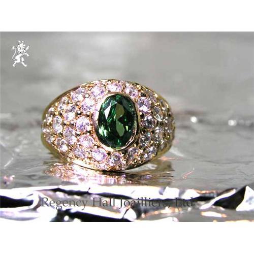 Brilliant Flawless Oval Simulated Emerald (YAG ytrium, aluminum, garnet)center stone Ring, paved with tiny brilliant Cubic Zirconium round stones. Hand Crafted Mounting in 18k Gold plate on Sterling Silver. Perfect for summer days and evenings. Goes great with jeans. Size 5 3/4.