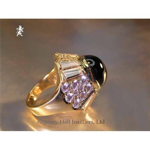 All white stones have been selected to match in color and brilliance. The major stone, the Cabochon, measures 15mm by 13mm. The ring is solid 18k Gold and the size is 6 1/2. Note the quality of the manufacturing in the photos. This ring was created in the early eighties by Regency Hall Joailliers, Ltd.