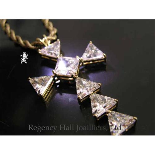 A stunning Cross of Cubic Zirconium Trillions! Unique and sophistocated in Solid 18k yellow Gold. A perfect gift that says so much. Can be worn day or night, dress or casual. Treat yourself or someone you love. The chain is not included.