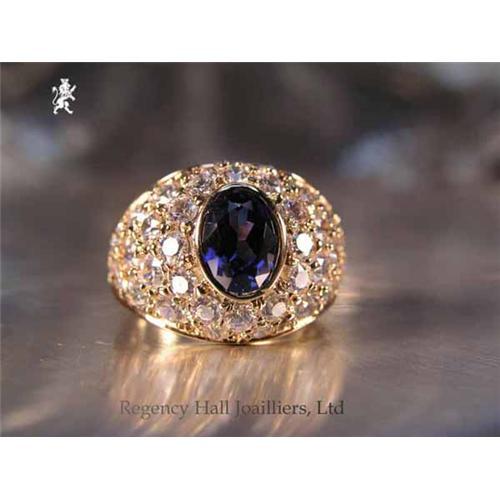 Read this description. Know what you are buying. Brilliant Flawless Oval Synthetic Blue Stone Ring, paved with tiny brilliant Cubic Zirconium rounds. This stone was cut from manmade corundum. Corundum is the material the natural stone is made from inside the earth, so our synthetic has the same physical and optical properties as the natural. The white side stones are brilliant, clear, top quality Cubic Zirconium.