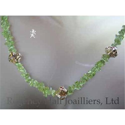 Beautiful rich peridot pebbles in a 16" necklace accented with gold filled balls and a gold filled clasp. Wear it day or night.