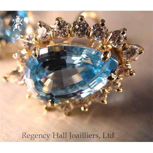 Read this description. Know what you are buying. Brilliant Intense Simulated Aqua Pear Shape Cubic Zirconium Earrings surrounded with Pure White Flawless Round White Cubic Zirconium in Solid 18k Gold. Small hooks receive drops for a more formal look. Each Pear is 14x10 mm. These stones are finely crafted, rare and expensive! You are bidding on quality: the stones, the cutting, and the manufacturing! These earrings were created in the early eighties by Regency Hall Joailliers, Ltd.