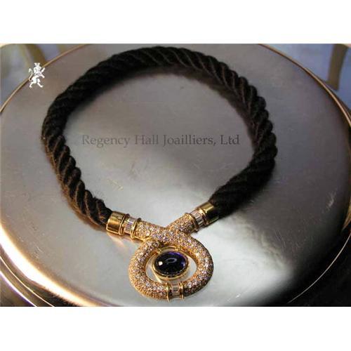 The Necklace is solid 18k Gold with a silk/rayon cord. Note the quality of the manufacturing and the quality design and materials. This Necklace can stand on its own merit! This necklace was created in the early eighties by Regency Hall Joailliers, Ltd. One of a kind. Subject to Prior Sale.