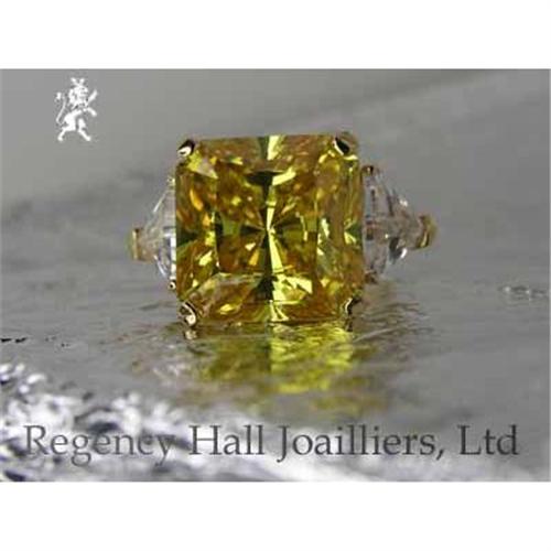 This fabulous Hand Set Ring in Heavy 18K Gold plate on Solid Sterling Silver sports a magnificently brilliant Deep Canary, Square Cubic Zirconium. The white Cubic Zirconium trillions have been selected to match in color and brilliance. The major stone measures 15mm by 15mm. The ring size is 6.5. Note the quality of the manufacturing in the photos.