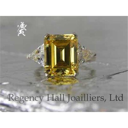 Brilliant Flawless Octagon Cut Canary Cubic Zirconium Ring, with 2 side stones of brilliant Cubic Zirconium trillions. Hand Crafted Mounting in 18k Gold finish on Sterling Silver. Size 5. Perfect for a dream evening.