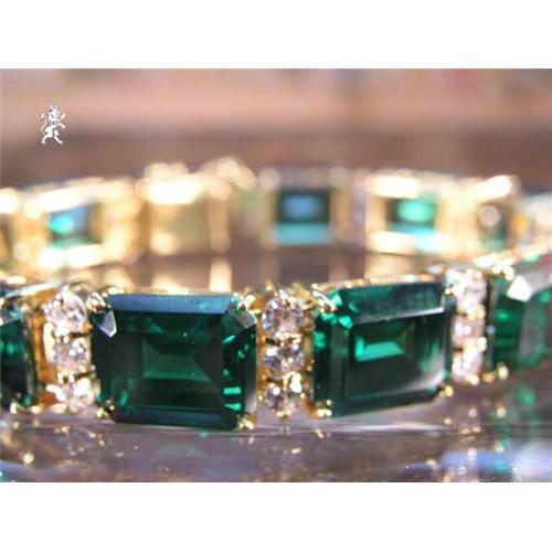 Read this description. Know what you are buying. Here is a bracelet to put the glow in a glamorous evening. All stones have been selected to match in color and size. The green YAGs (ytrium, aluminum, garnet)measure 12mm by 10mm which represents approximately 6 cts each. The white Cubic Zirconium rounds are 4mm in size or about 0.25 ct each. There are 36 white Cubic Zirconium and 12 green YAGs. The greens have even been given flaws to increase the light refraction as is the case in the finest of the natural. The bracelet is Solid Sterling Silver with Heavy 18k Gold plate and is 7.25 inches long. Note the quality manufacture in the photos. This bracelet was created in the early eighties by Regency Hall Joailliers, Ltd.