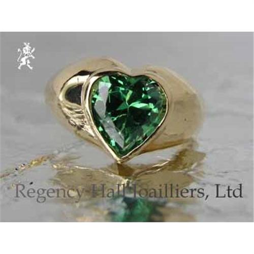A Heart shape Simulated Emerald (YAG: ytrium, aluminum, garnet) Columbian Green Ring bezel set for sport or dress. So easy to wear with jeans and shorts, yet lends its air of elegance. The stone is approximately 1.5 cts. The ring is hand crafted, and the stone is hand set. The ring is made of Heavy 18k Gold over Solid Sterling Silver. Size 6 .