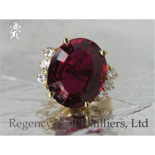 This spectacular Oval Synthetic Ruby Ring is perfect for day or night. This stone was cut from manmade corundum. Corundum is the material the natural stones are made from inside the earth, so our synthetic has the same physical and optical properties as the natural. The white side stones are brilliant, clear, top quality Cubic Zirconium. These Pure White side stones set off the center oval to perfection. The ring is Heavy 18k Gold over Solid Sterling Silver. Size 6 1/2.