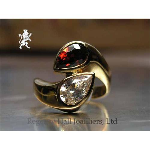 Read this description. Know what you are buying. A brilliant 6x8 mm Red Synthetic Ruby Pear and a matching 6x8 White Cubic Zirconium Pear cross over each other in a bezel set modern high polished 18k gold plate on sterling silver ring. The red stone was cut from manmade corundum. Corundum is the material the natural stone is made from inside the earth, so our synthetic has the same physical and optical properties as the natural. The white side stones are brilliant, clear, top quality Cubic Zirconium.