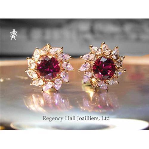 Read this description. Know what you are buying. These interesting Synthetic Ruby round earrings are designed in a left and right cartwheel of brilliant Cubic Zirconium pears. These fine stones are hand set in 18k plate on sterling silver. The center stones are rich intense red, and were cut from manmade corundum. Corundum is the material the natural stones are made from inside the earth, so our synthetic has the same physical and optical properties as the natural ruby. These earrings will stand the ultimate test of being worn right next to the natural. These earrings were created in the early eighties by Regency Hall Joailliers, Ltd.