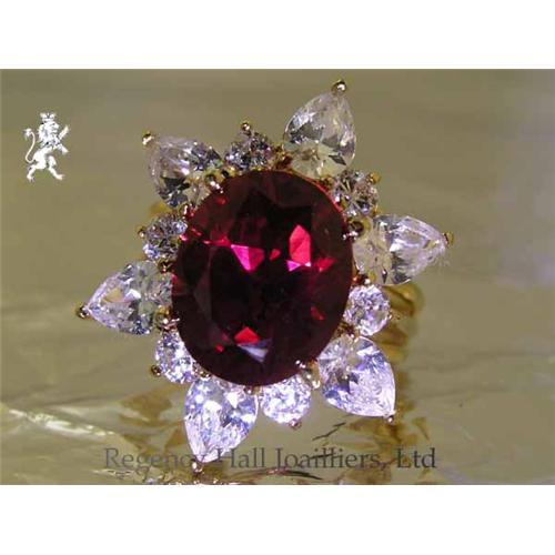 Read this description. Know what you are buying. This fabulous Hand Set Ring in 18K gold plate on Sterling Silver sports a magnificently brilliant Rich Red synthetic Ruby Oval. This stone was cut from manmade corundum. Corundum is the material the natural stone is made from inside the earth, so our synthetic has the same physical and optical properties as the natural. The white side stones are brilliant, clear, top quality Cubic Zirconium.