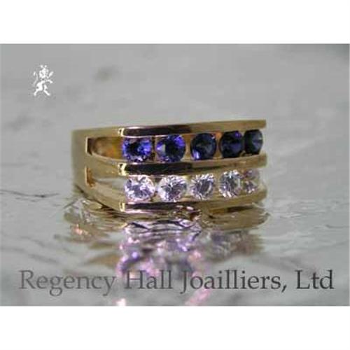 This pretty little ring has a semi-wide band. Two rows of stones are channel set into the crown. One row is matched synthetic sapphire and the other is matched pure white Cubic Zirconium rounds. The center stone was cut from manmade corundum. Corundum is the material the natural stone is made from inside the earth, so our synthetic has the same physical and optical properties as the natural. The white side stones are brilliant, clear, top quality Cubic Zirconium.