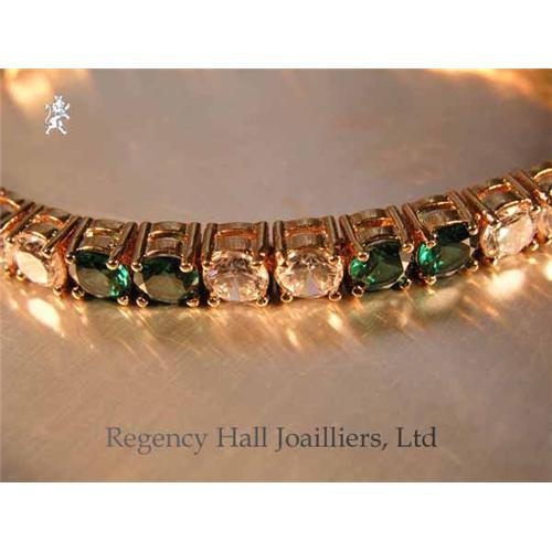 Read this description. Know what you are buying. Brilliant Pure White Round White Cubic Zirconium and created fire-y Green Simulated Emerald (YAG: ytrium, aluminum, garnet)Stones in 18k Gold plate on Sterling Silver. 7 inches long, 40 stones each measuring 4mm or 0.33ct. This bracelet was created in the late seventies by Regency Hall Joailliers, Ltd.